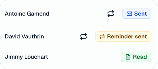 No need to choose your recipients, they are there, your report is compressed, your readers have a mobile view. No more forgotten attachments. Branded signature. Send lated. You know who has read your file and you remind the others. The document locks after the contractual deadline.