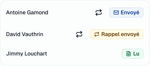 Pas besoin de choisir vos destinataires, ils sont là, votre rapport est compressé, vos lecteurs ont une vue mobile. Plus de pièces jointes oubliés. Signature à votre style. Envoi programmé. Vous savez qui a lu votre fichier et vous relancez les autres. Le document se verrouille après la date limite contractuelle.