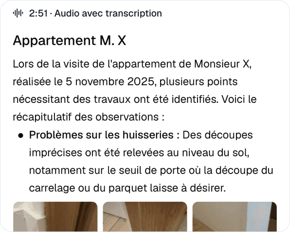 Photos et audio. En visite ou en réunion, there enregistre et restitue des notes complètes, synthétiques, en identifiant les intervenants.
