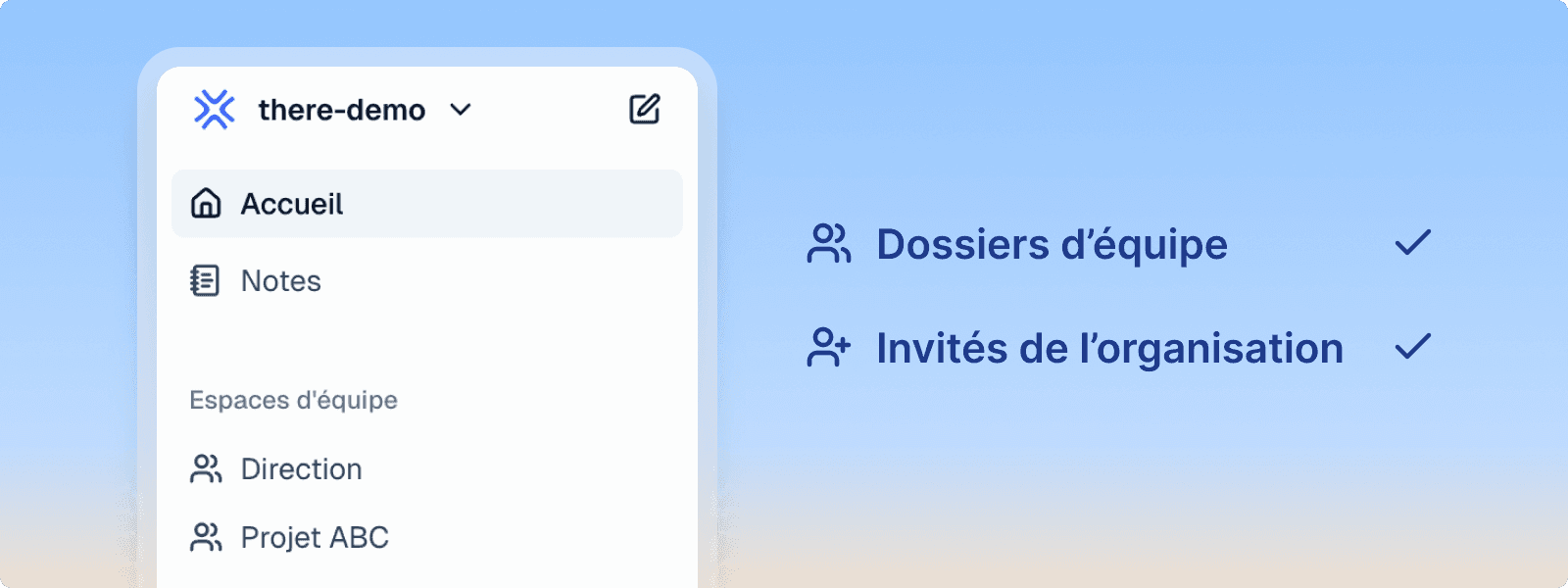 Créez des espaces d'équipe dédiés pour mieux organiser vos documents par projet. Vous pouvez inviter des collaborateurs externes directement dans un espace : ils sont automatiquement ajoutés avec le nouveau droit "Invité" et ont accès uniquement à cet espace et aux notes, sans pouvoir voir les autres documents de l'organisation.