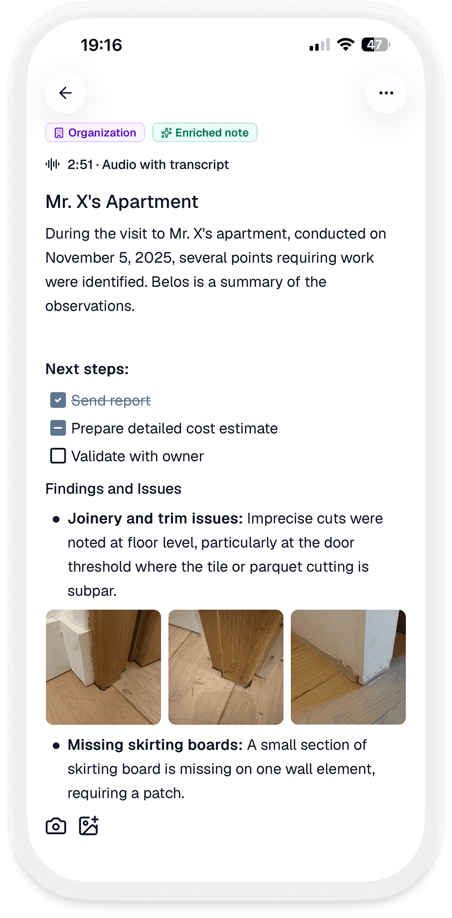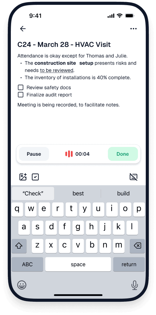 Whether you're a consultant creating detailed reports, a construction professional documenting your projects, or a researcher organizing your technical monitoring, our solution adapts to your specific needs. Never let crucial information slip away again: capture it on the go, then easily transform these notes into impeccable professional documents.